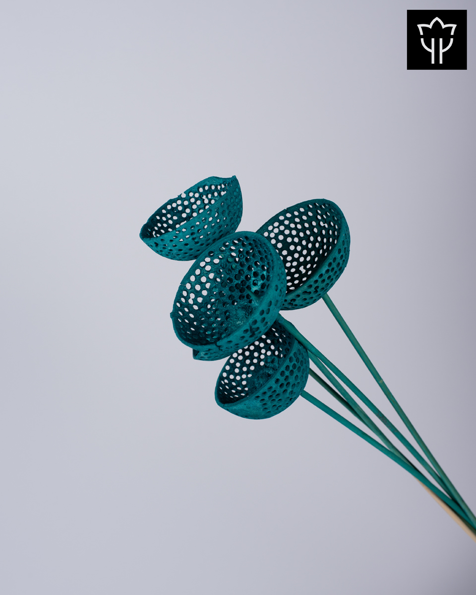 Αποξηραμένοι καρποί Bell Cups σε τιρκουάζ απόχρωση ιδανικοί για δημιουργία ιδιαίτερων διακοσμητικών συνθέσεων, διακόσμηση βιτρίνας, στολισμό εκδηλώσεων ή τοποθέτηση σε βάζα και διακοσμητικά κασπώ. Τα Bell Cups ξεχωρίζουν για το χαρακτηριστικό κυψελωτό σχήμα τους που δημιουργεί έντονη υφή και οπτικό ενδιαφέρον μέσα σε κάθε σύνθεση. Η μοντέρνα τιρκουάζ απόχρωση προσθέτει φρέσκο και σύγχρονο αισθητικό αποτέλεσμα, ταιριάζοντας ιδανικά σε boho, contemporary και θεματικές διακοσμήσεις.