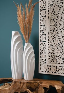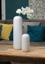 Διακοσμητικό κεραμικό βάζο σε λευκή απόχρωση με μοντέρνο και minimal σχεδιασμό, ιδανικό για συνθέσεις με φρέσκα ή αποξηραμένα λουλούδια, ενώ μπορεί να χρησιμοποιηθεί και ως αυτόνομο διακοσμητικό στοιχείο. Το επιμήκες σχήμα και οι λεπτές οριζόντιες γραμμές δημιουργούν ένα σύγχρονο και κομψό αισθητικό αποτέλεσμα που ταιριάζει εύκολα σε διαφορετικά στυλ διακόσμησης. Η ματ επιφάνεια και το καθαρό λευκό χρώμα προσφέρουν διακριτική κομψότητα και φωτεινή αισθητική στον χώρο. Κατάλληλο για διακόσμηση εκδηλώσεων, τοποθέτηση σε τραπέζια, ράφια ή κονσόλες, προσθέτοντας minimal και σύγχρονο χαρακτήρα.