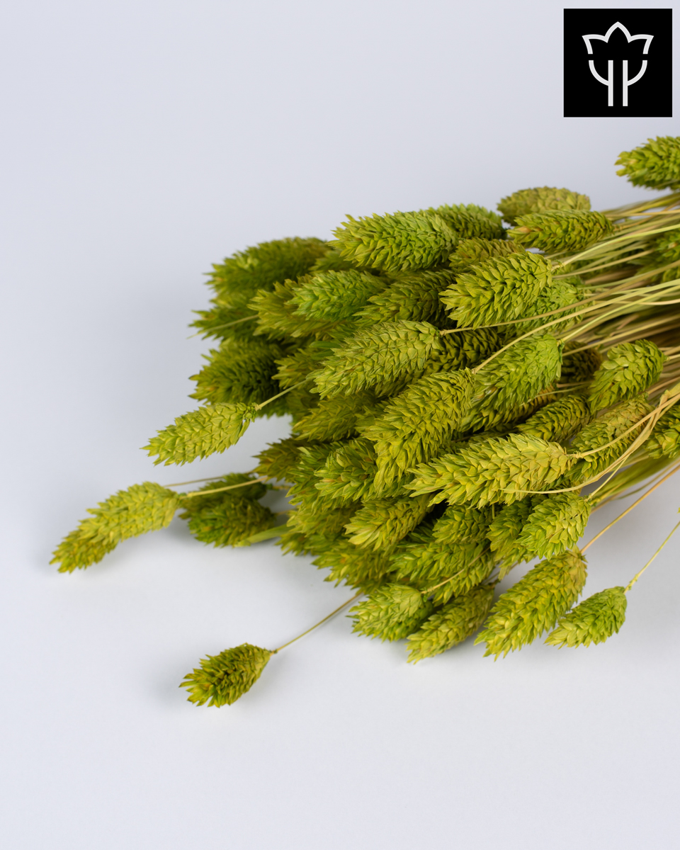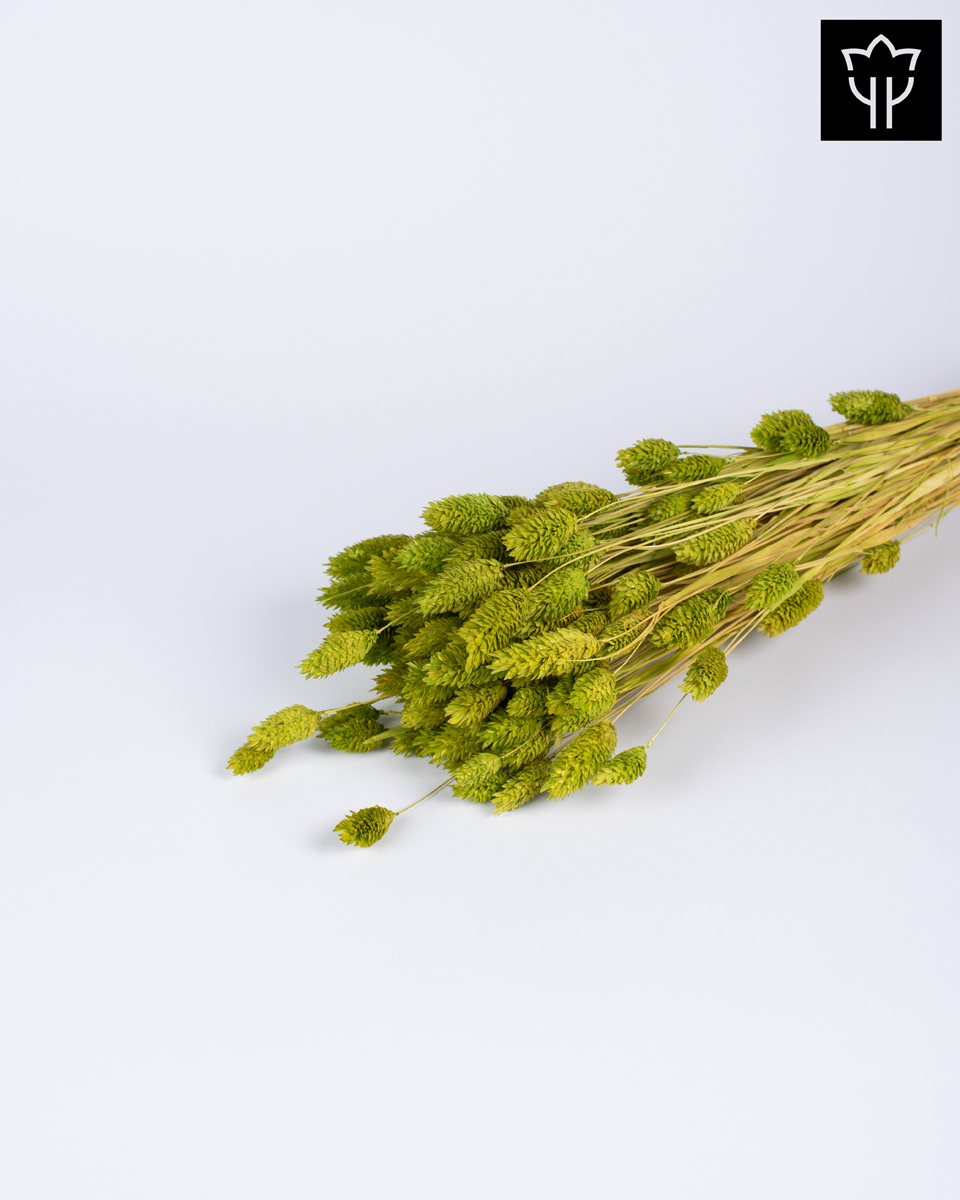 Αποξηραμένο διακοσμητικό Phalaris σε πράσινη απόχρωση, ιδανικό για δημιουργία κομψών διακοσμητικών συνθέσεων, διακόσμηση βιτρίνας, στολισμό εκδηλώσεων ή τοποθέτηση σε βάζα και διακοσμητικά κασπώ. Το Phalaris ξεχωρίζει για τα μικρά, στρογγυλεμένα στάχυά του που προσθέτουν ιδιαίτερη υφή και φυσικό όγκο σε κάθε σύνθεση. Η φωτεινή πράσινη απόχρωση δημιουργεί φρέσκο και φυσικό αισθητικό αποτέλεσμα, ταιριάζοντας ιδανικά σε boho, natural και σύγχρονες διακοσμήσεις. Αποτελεί εξαιρετική επιλογή για ανθοπωλεία, καταστήματα δώρων και επαγγελματικές διακοσμήσεις.
